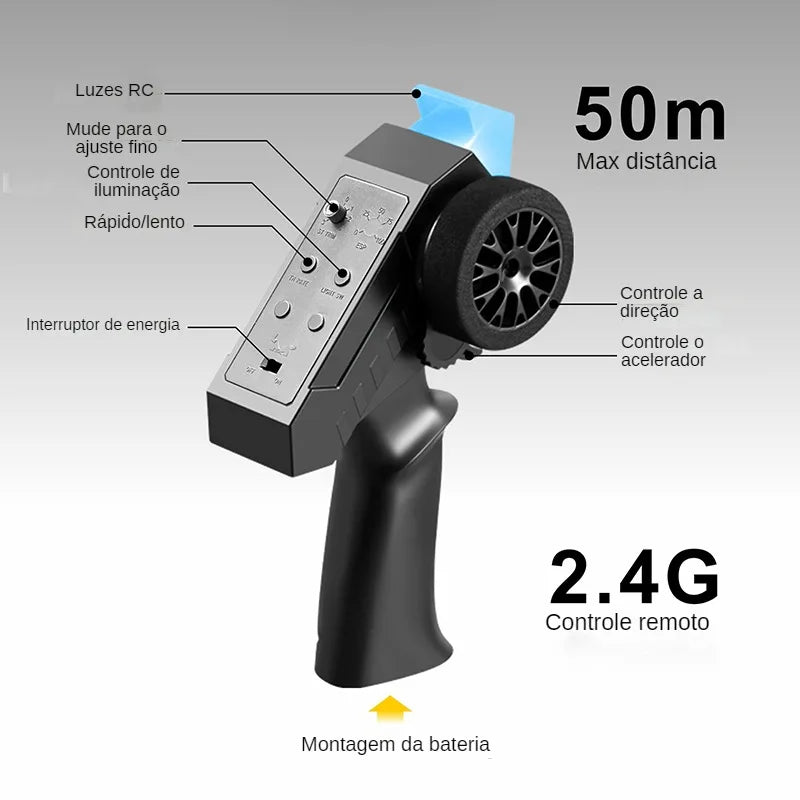 Controle 2.4GHz – Alcance de até 50 metros, sem interferências.