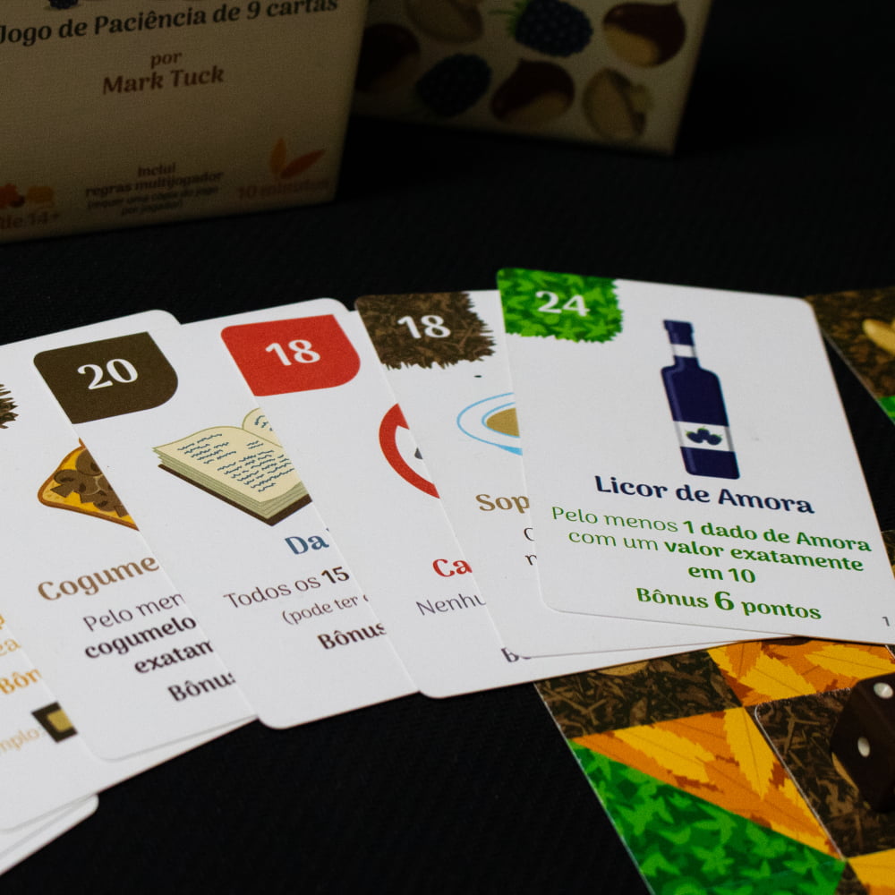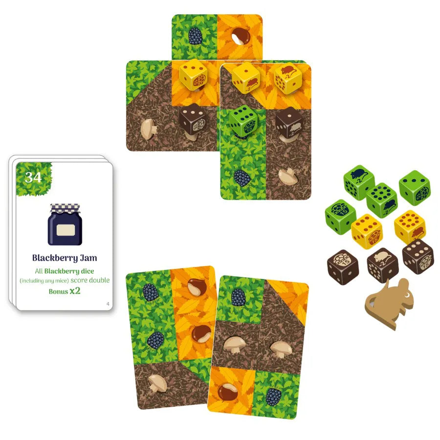 Suas 18 cartas mostram diferentes tipos de áreas florestais, onde você encontrará amoras silvestres, castanhas e cogumelos comestíveis. Algumas áreas são divididas em dois tipos que, juntamente com os dados personalizados com ratos de madeira famintos, oferecem novas oportunidades e diferentes estratégias para aumentar sua colheita.