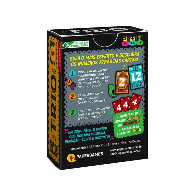 Trio é um jogo de cartas rápido e envolvente em que os jogadores tentam reunir três cartas iguais (os “trios”). O diferencial está na forma de conseguir essas cartas: através de palpites certeiros sobre o que os outros jogadores têm na mão ou o que está escondido no monte. É um jogo simples, mas cheio de blefe, memória e atenção, garantindo partidas divertidas e cheias de reviravoltas.